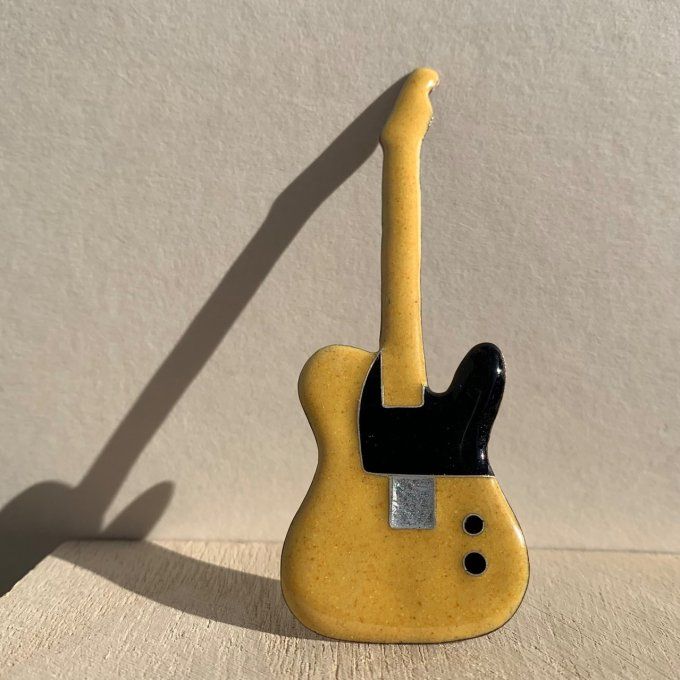 Broche jaune et noir en forme de guitare Fender en émaux sur cuivre cloisonnés
