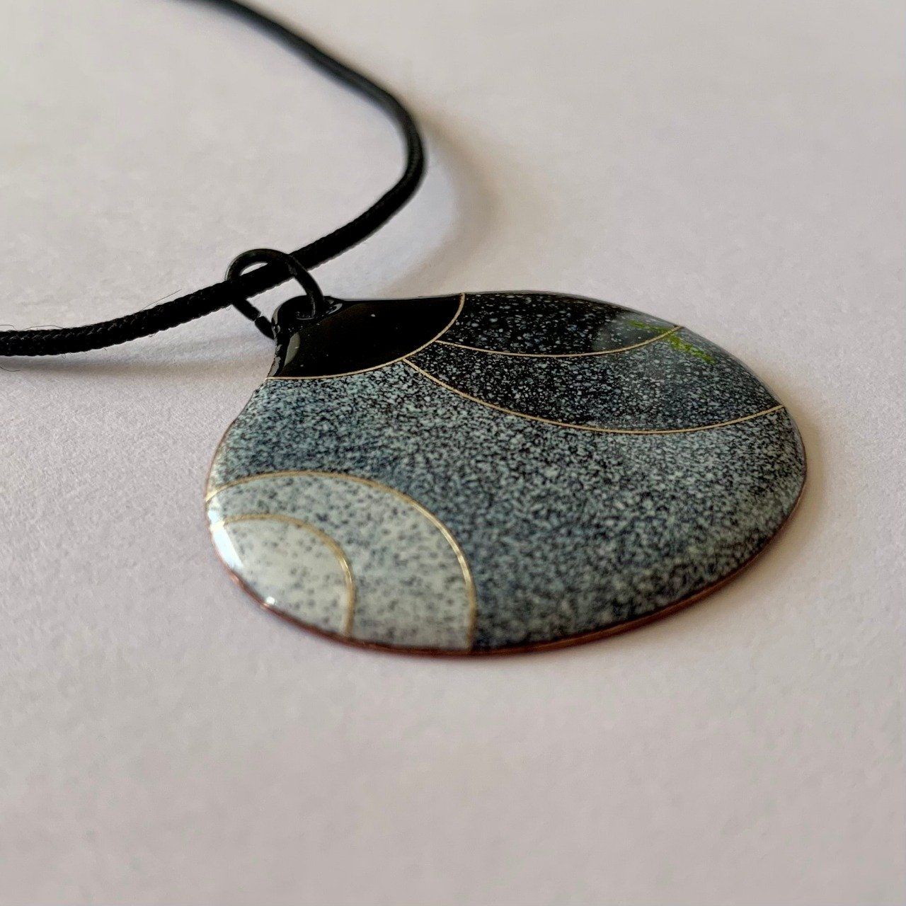 Dégradé très doux de gris chiné pour ce pendentif en émaux sur cuivre cloisonnés, tout en élégance.